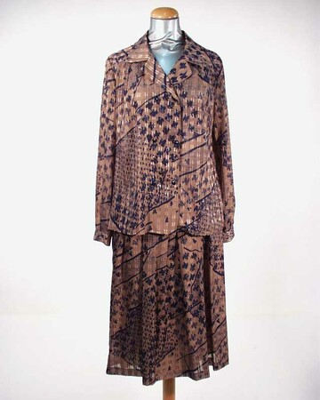 Kostüm gemustert beige/blau 2tlg 2rhg Bluse mit Revers Rock Keller- und Liegefalten /Baruch