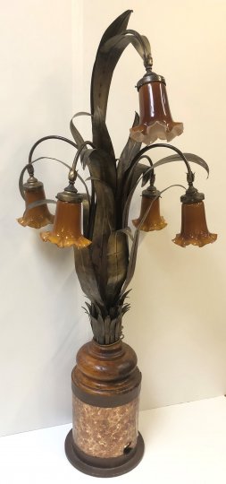 Stehlampe, Palmenblätter, 5-flg., verzierte Glastulpen, gedrehter Holzsockel, braun, Höhe 190cm